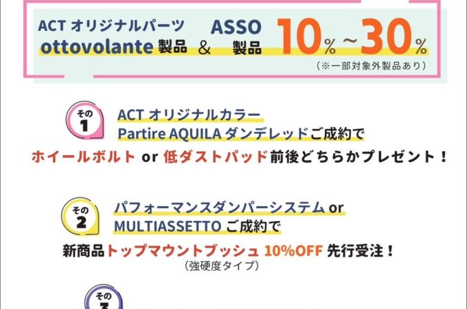 今年から各地で開催をさせて頂いております、パフォーマンスダンパーシステムの乗り味をご体感頂く企画! 「ASSO車高調キャラバン!!...