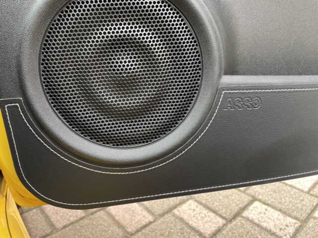 白いやつ君の純正サベルトシートは赤ステッチなのでキックガードも赤ステッチ&カーボン調を取付けていますが、黄色いやつ君の純正サベルトシートは白ステッチ&ブラックレザー!