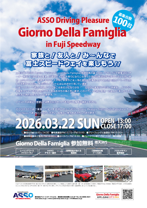 「ASSO Driving Pleasure Giorno Della Famiglia 2026 in Fuji Speed way 」を今年も開催させて頂きます!
