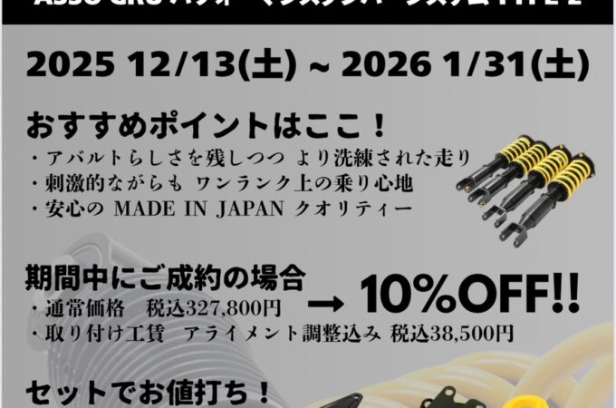 全国各地で開催をさせて頂いております、ASSO車高調体感キャラバン! 2025年最後の開催となります! 12月6日(土曜)7日(日...